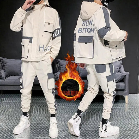 Men's Autumn Winter Sportswear Sets Fashion Two Piece Plus Velvet Thickening Jacket
