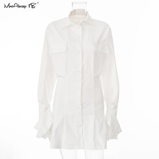 Pleated Shirt Dress for Women Flare Sleeve Elegant Office Dress Summer Green Tunic Casual Dress Mini