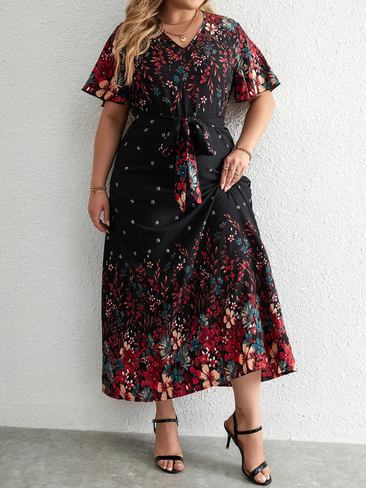 Plus Size Women's Summer V-Neck Short Sleeve Floral Print Long Dress