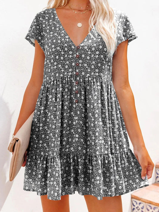 Summer V- Neck Women Sexy Floral Print Single-breasted Mini Dress