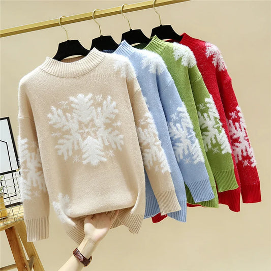 Winter Snowflake Pullover O-neck Casual Knitted Sweater for Women