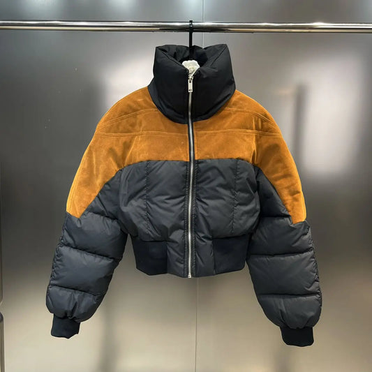 Winter Stand-up Collar Contrasting Color Women's Cropped Puffer Coat Bubble Bomber Jacket