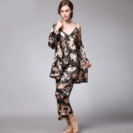 Women Silk Sexy Summer Lingerie Satin Dragon Long Sleeve Korean Three Piece Pajama Sets Gown