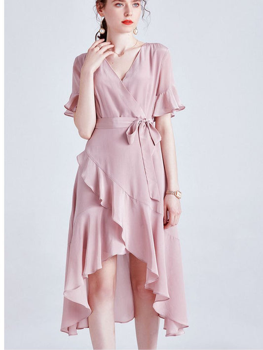 Luxury Women's elegant V-neck short-sleeved new slim style with irregular pure color silk bodice dresses