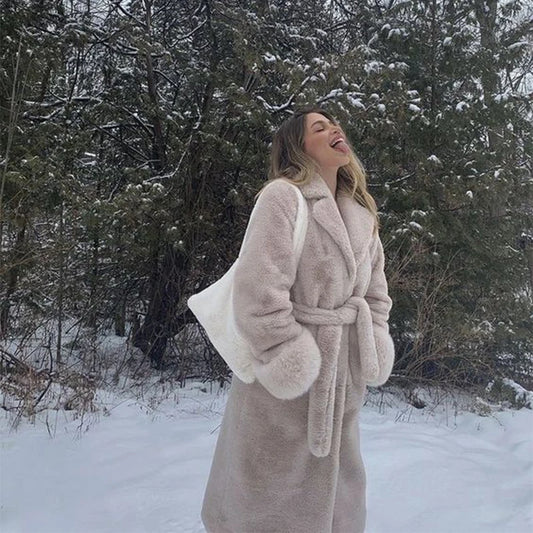Luxury Winter Long Overcoats Women Oversized Lapel Belted Faux Rabbit Fur Coat Jacket for women
