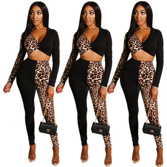Womens Workout Sets Solid Color Long Sleeve Leopard Print Stitching 2 Piece Trousers Set