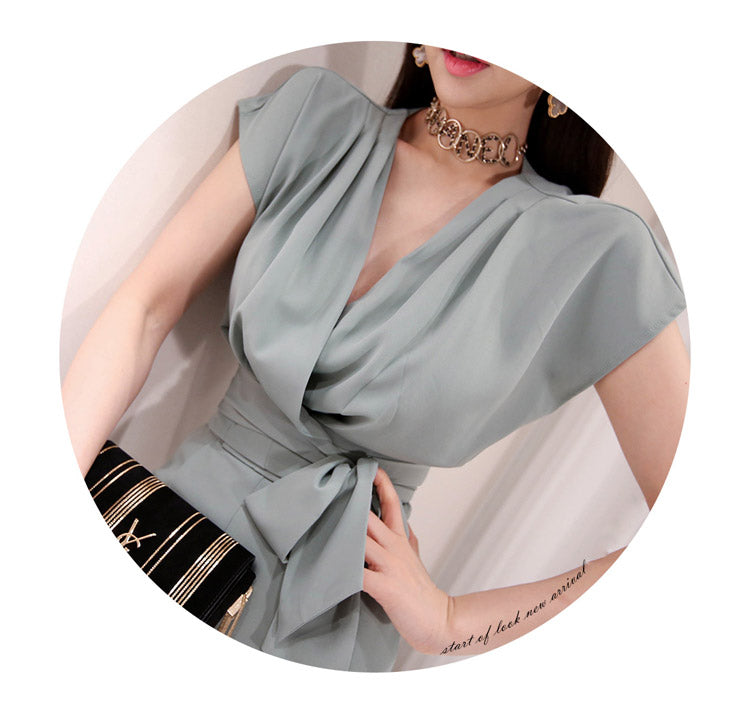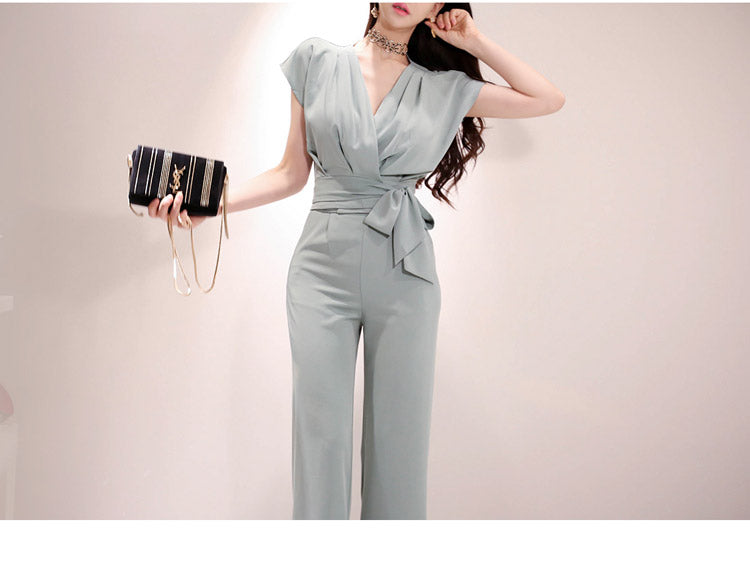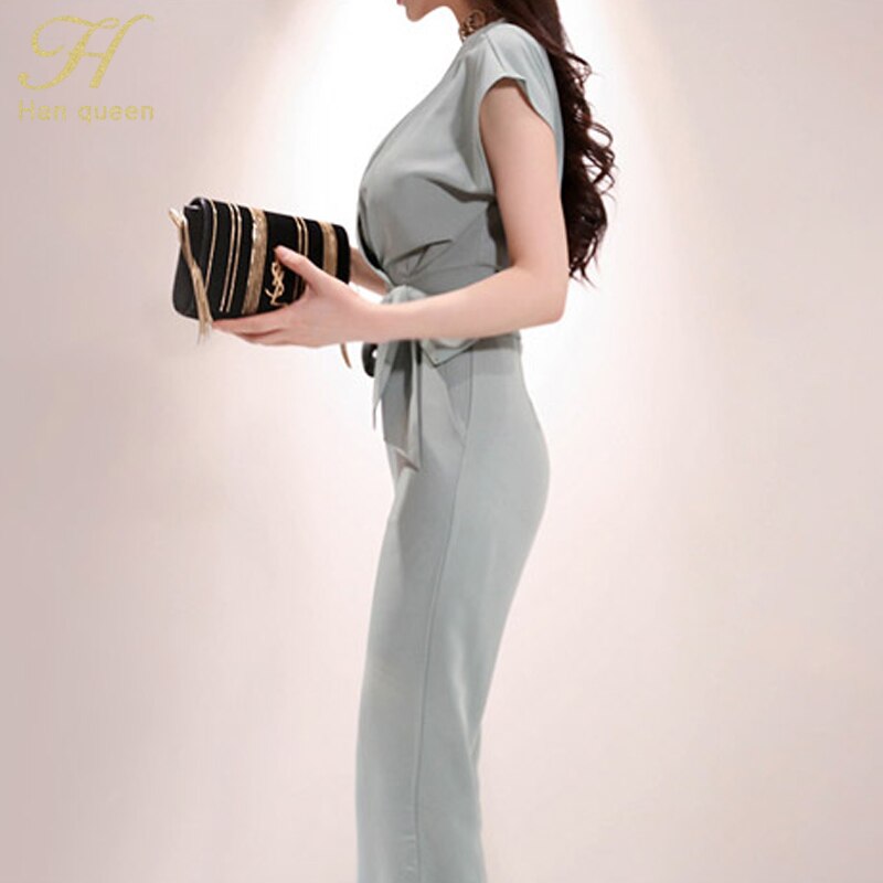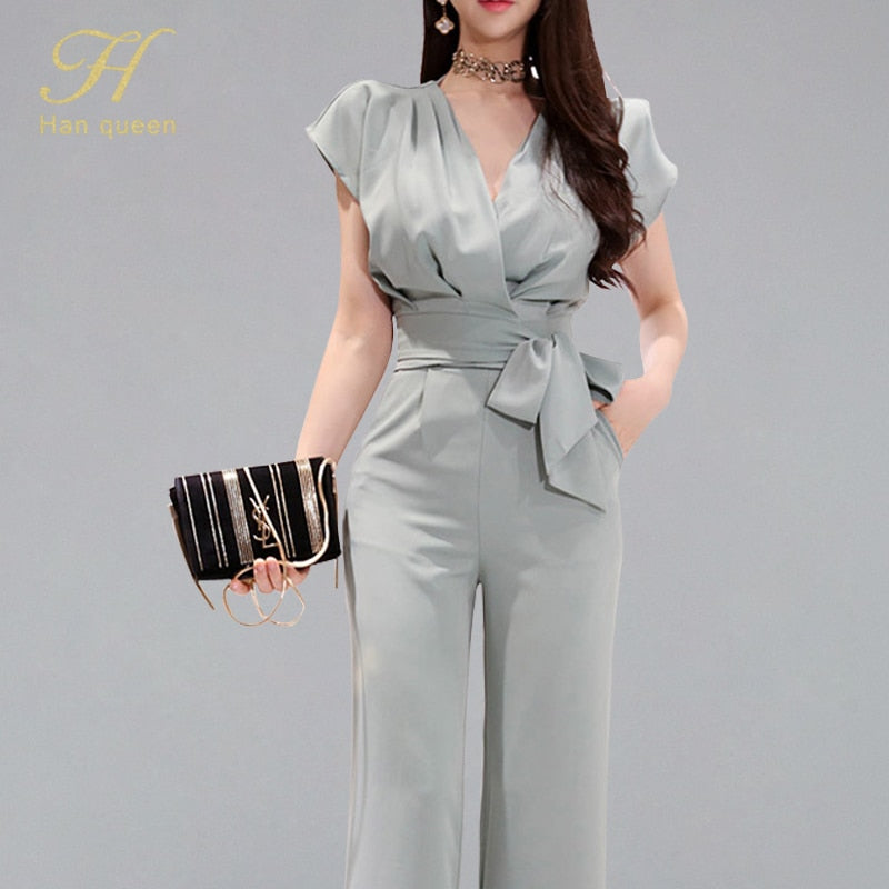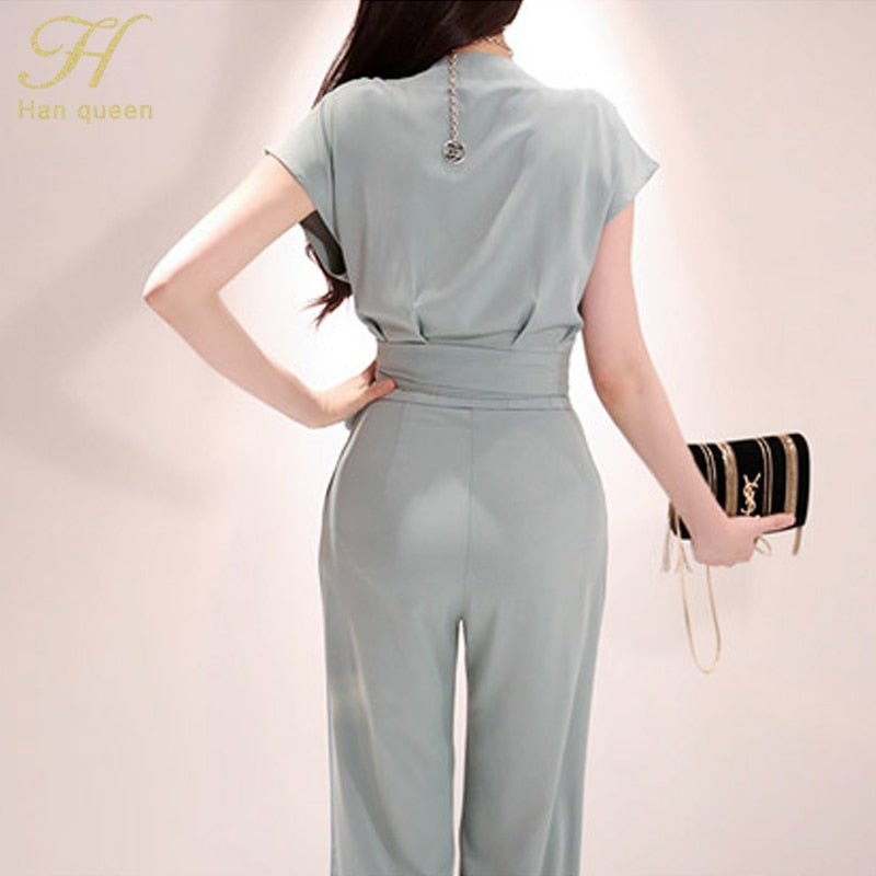 H Han Queen New Two piece Summer Elegant Women Suits; V-neck Lace Up Crop Top; High Waist Solid Color Long Pants Set