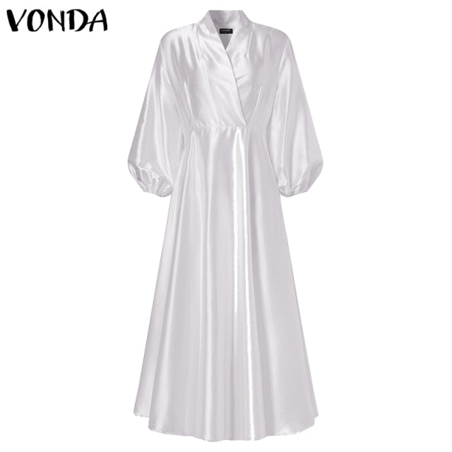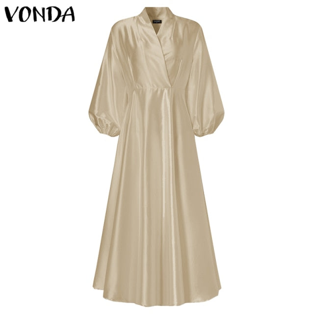 Women Autumn Long Maxi Party Dress 2021 VONDA Sexy V Neck Long Sleeve Solid Dresses Bohemian Vestidos Femme Satin Slik Sundress