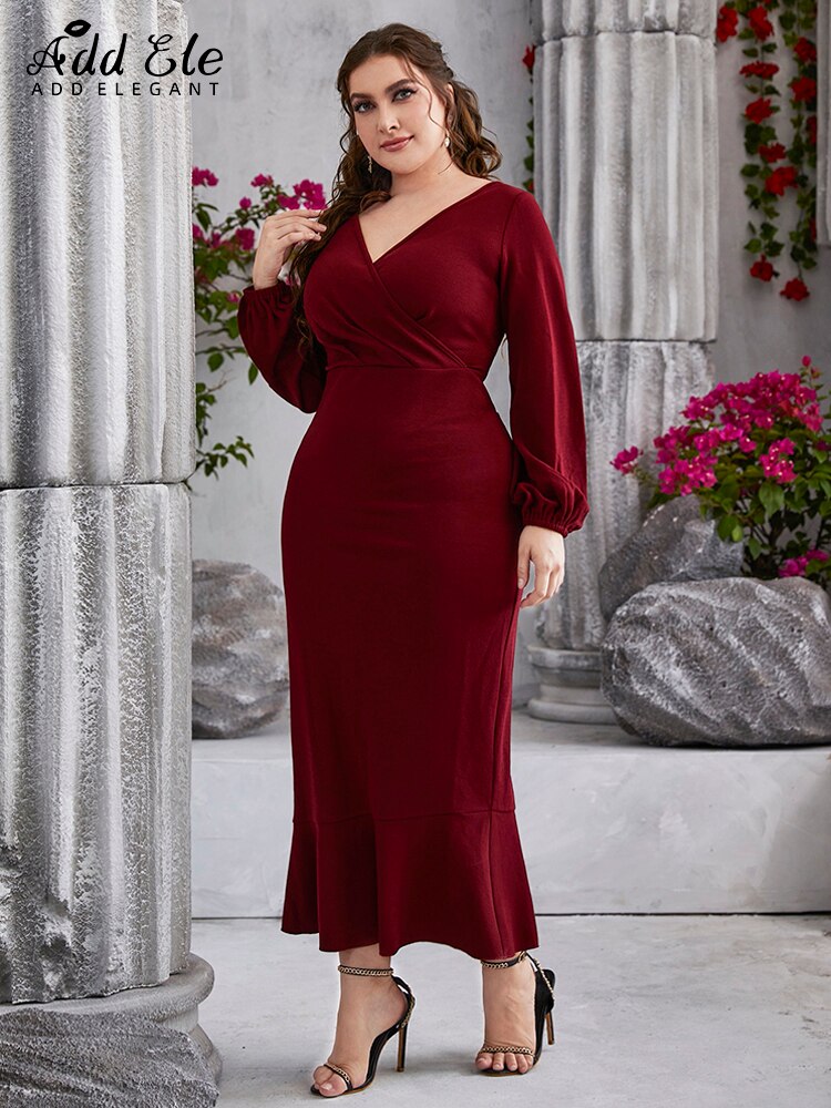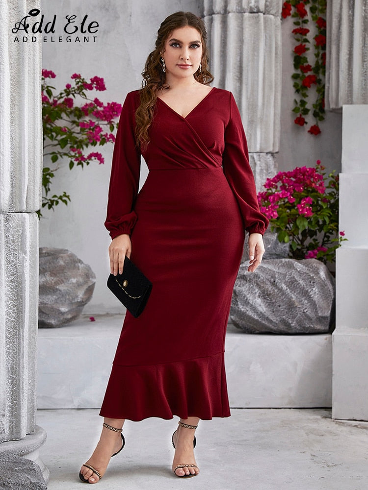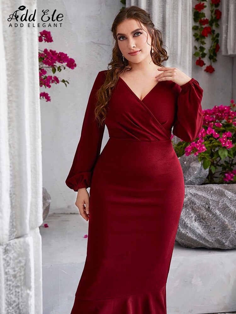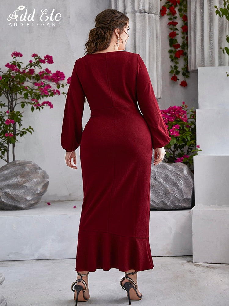 Elegant Plus Size Pencil Bodycon V-Neck High Waist Long Lantern Sleeve dress for women