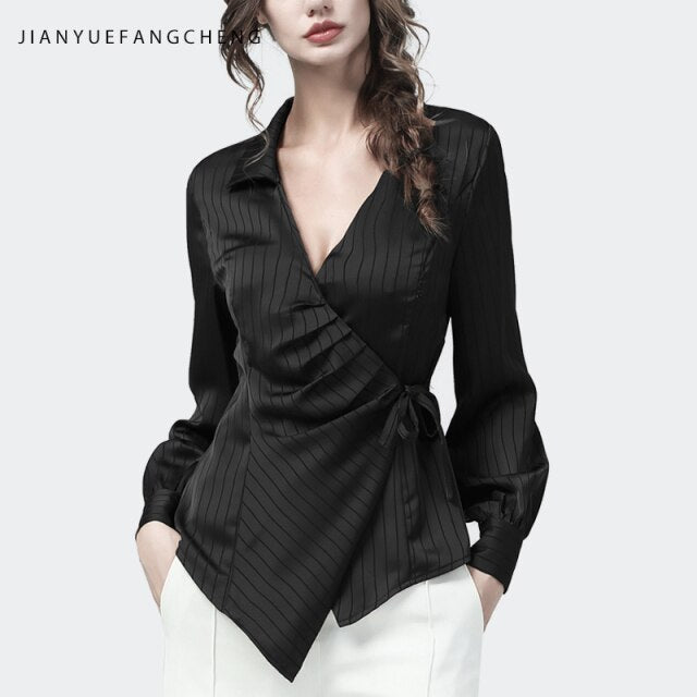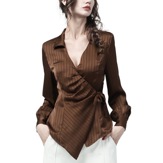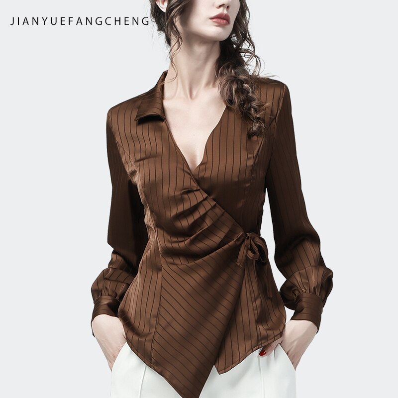 Fashion Women' Brown Striped Satin Blouse Long Sleeve V-Neck Lacing Shirt 2021 Autumn New Elegant Slim Irregular Tunic Tops