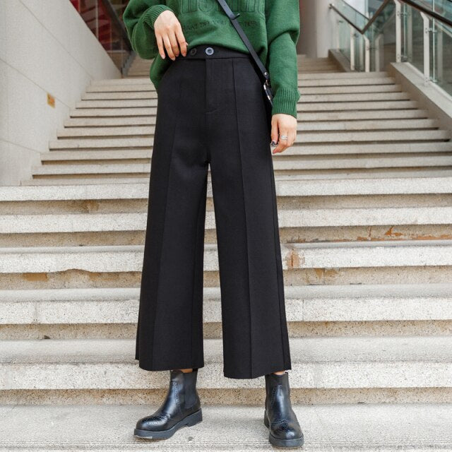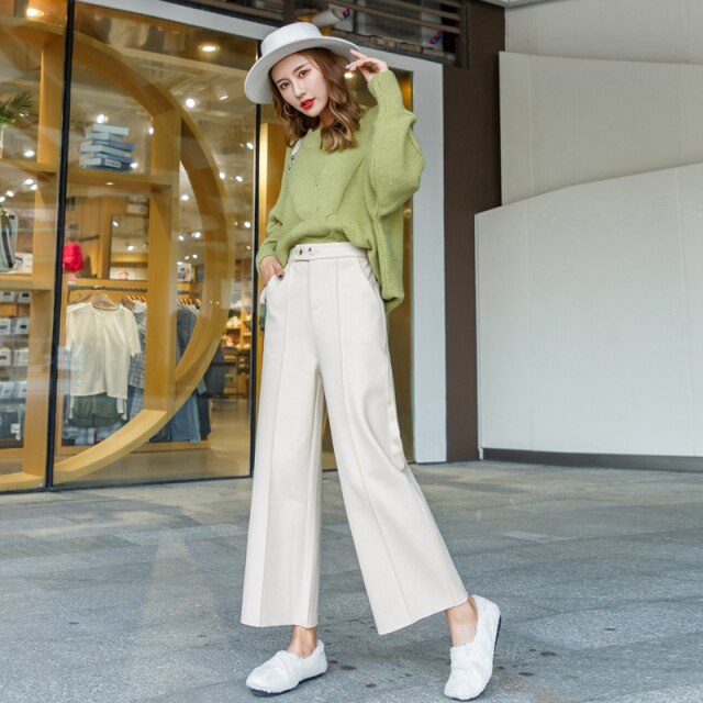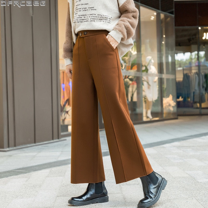 Loose Straight Woman Pants 2021 Korean Style Winter Woolen Ladies Trousers High Waist Wide Leg Pants Women Brown Or Black Beige