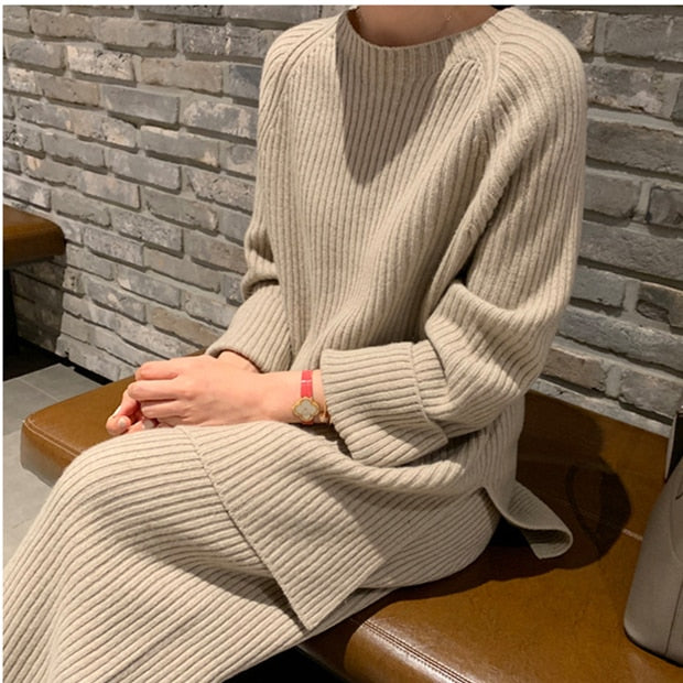 REALEFT 2021 Autumn Winter 2 Pieces Women Sets Knitted Tracksuit O-Neck Split Sweater and Wide Leg Jogging Pants Pullover Suits