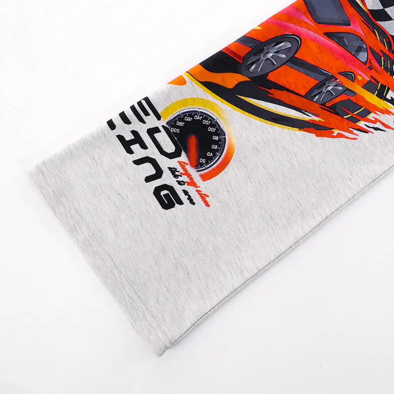 - Keep accessories minimal to let the racing track print on the top stand out.