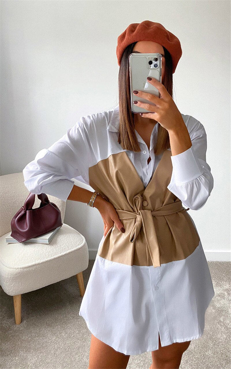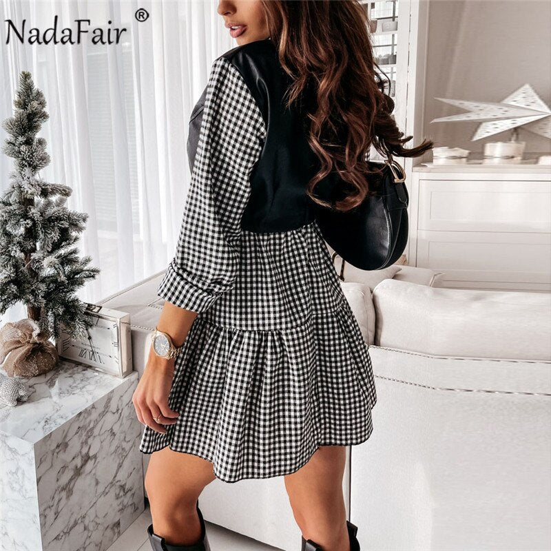 Women's Dress Casual A-Line PU Leather Patchwork Long Sleeve Vestidos Party Elegant Short Mini Dress