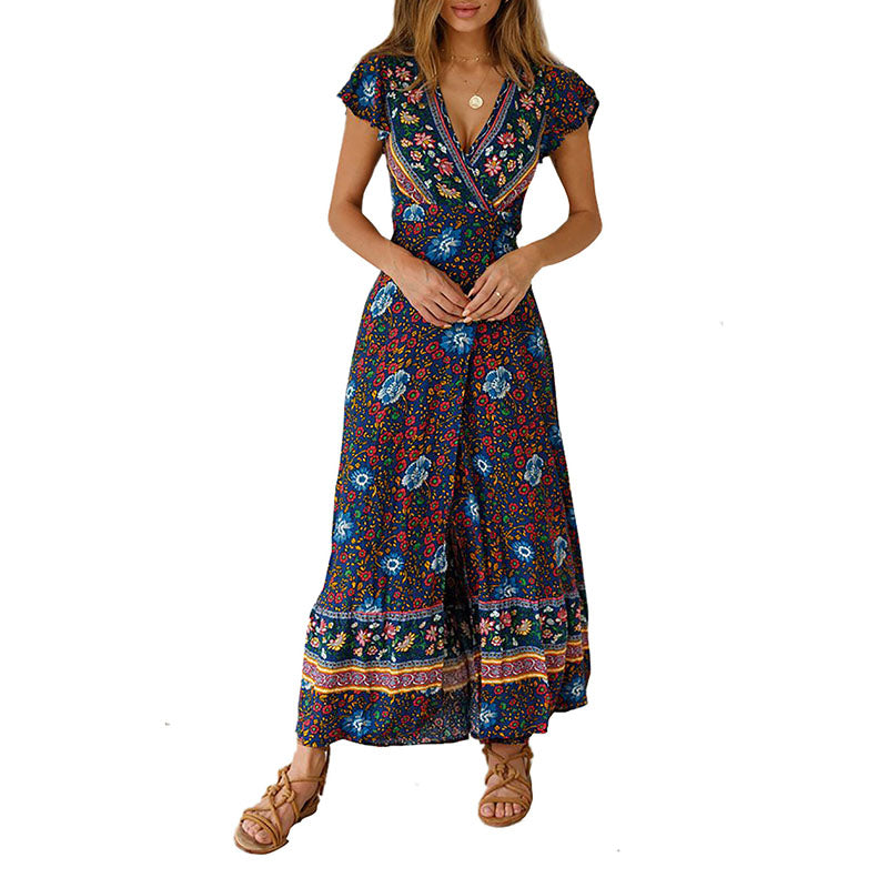 Bohemian Style Cotton Long Dress Floral Maxi Casual Short Sleeve V Neck Belt Wrap-body Dresses for Women