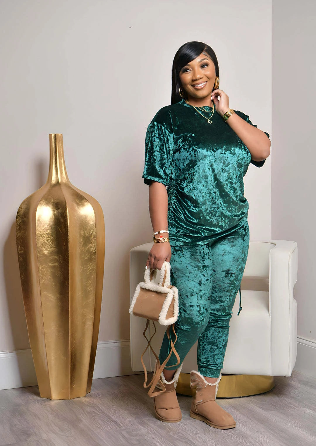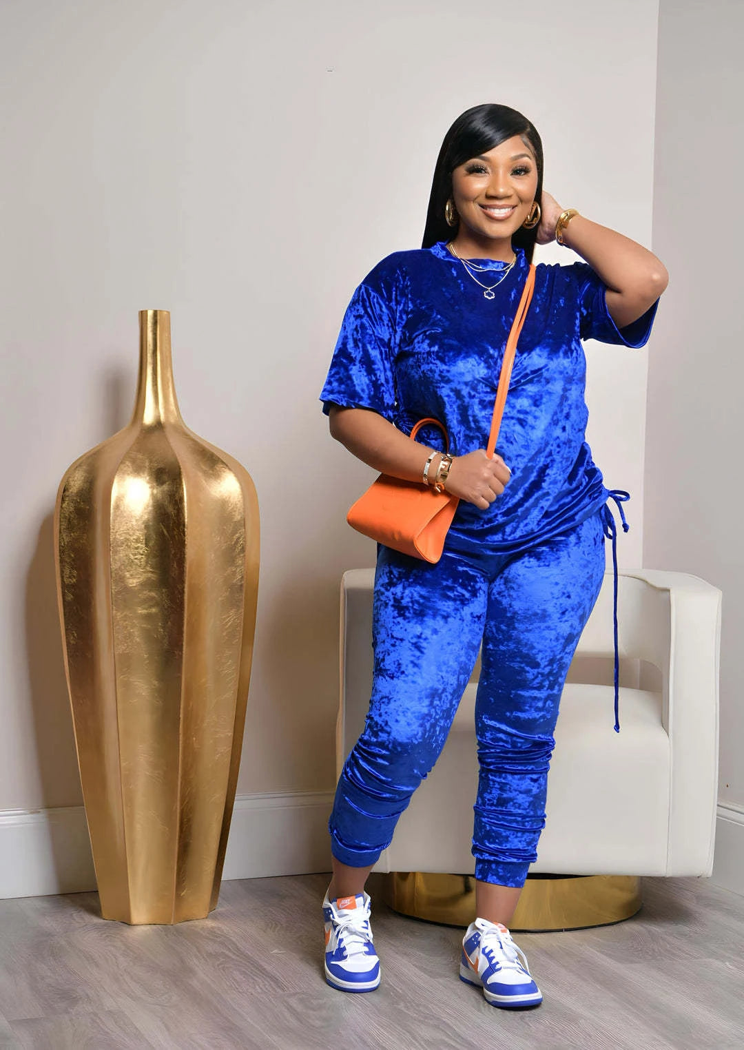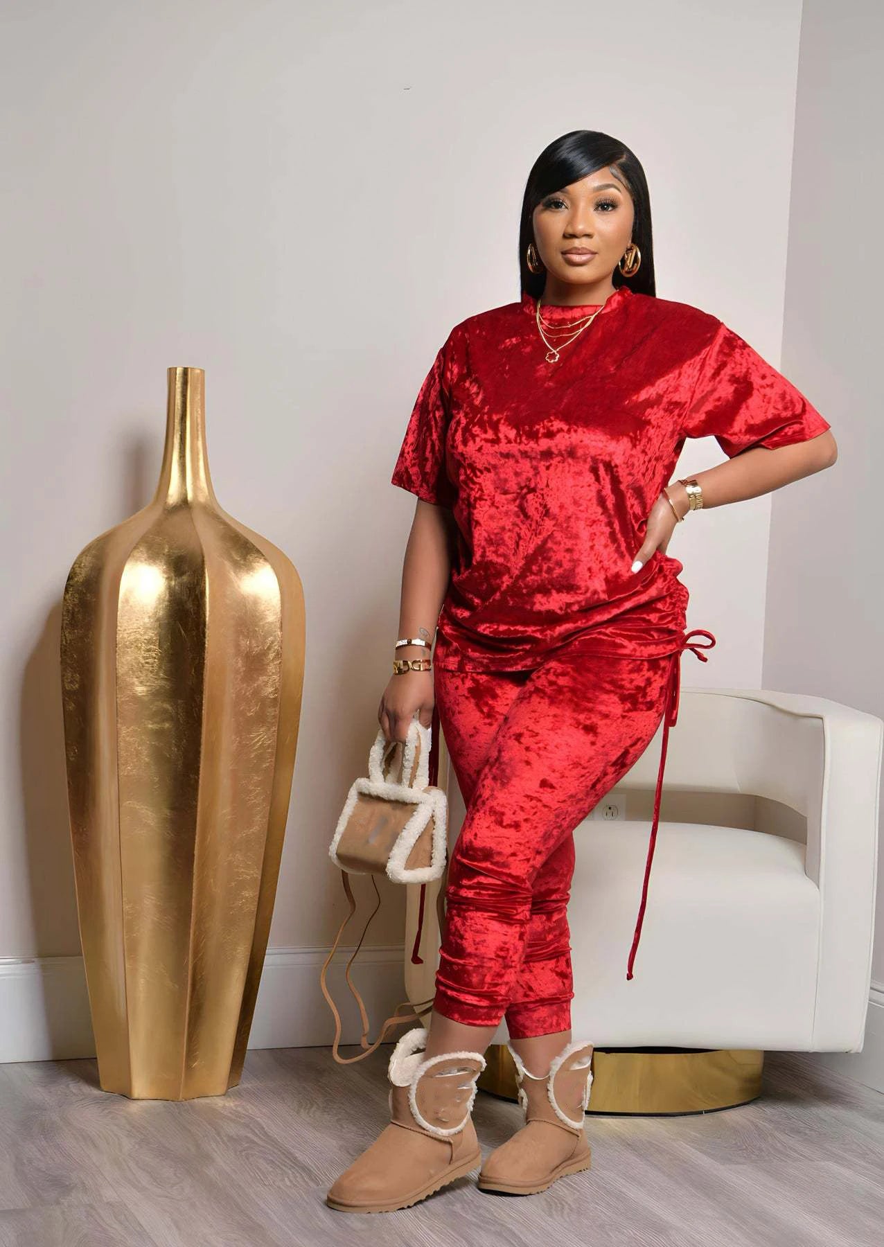 Introducing our latest arrival for the 2024 spring fashion season - the New Arrival Lady Street Wear Short Sleeve Velvet Drawstring T-shirt and Pants set.