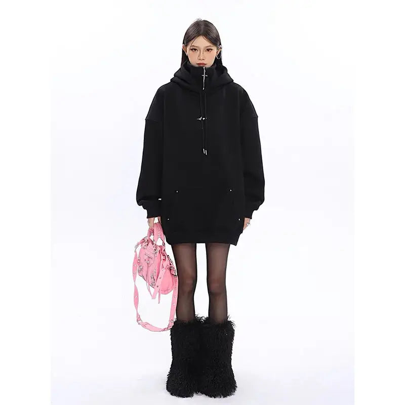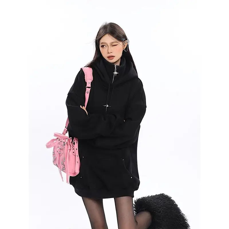 New Korean Simple Design Zipper Hoodie Winter Thickened Warm Loose top for female