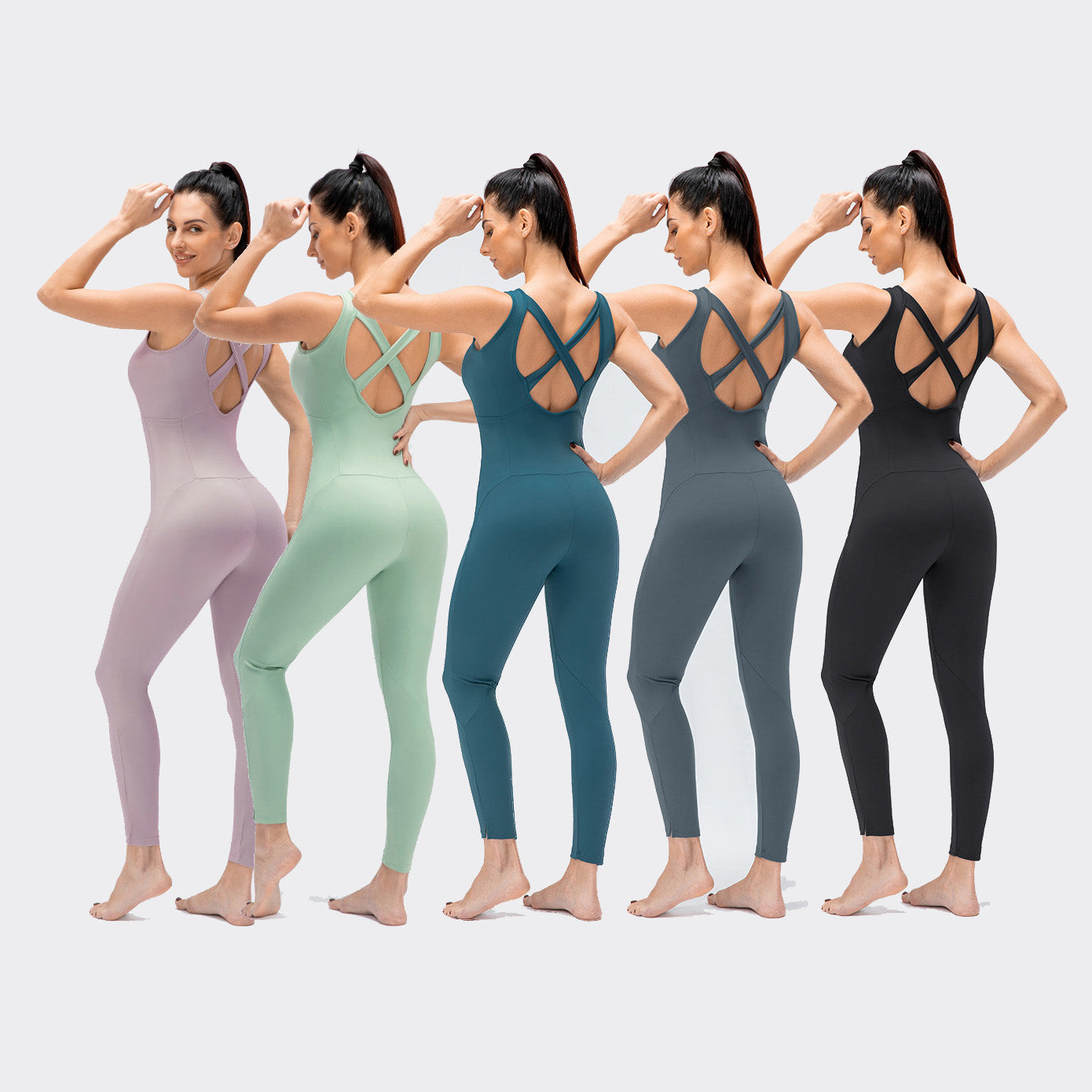 Quick dry cool feeling women's one-piece yoga overalls set sexy backless sports bodysuit fitness jumpsuit with pocket for women