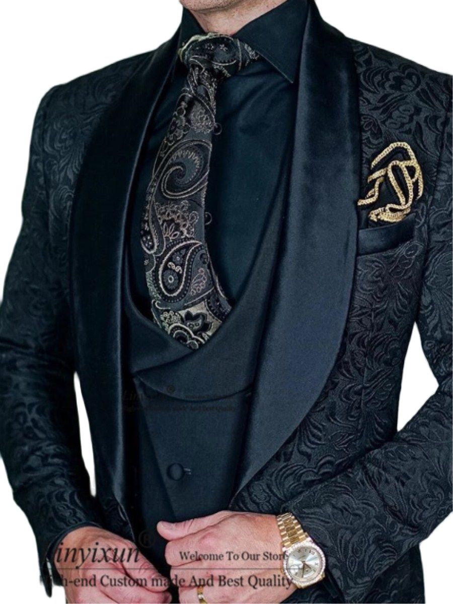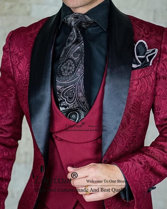 Tailor-Made Burgundy Wedding Men Suits Slim Fit 3 Pieces Suits Groom Prom Jacquard Blazer Suits