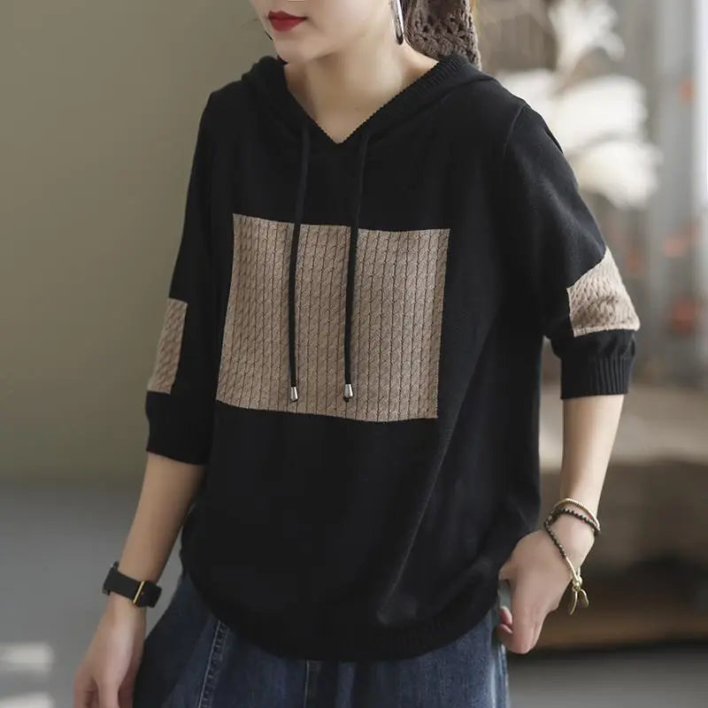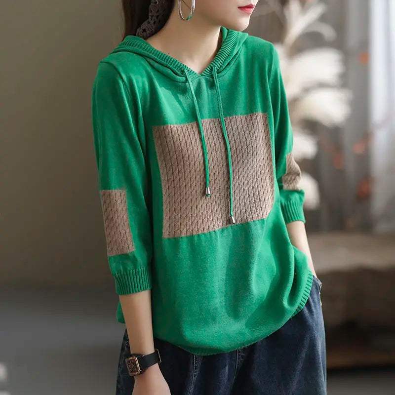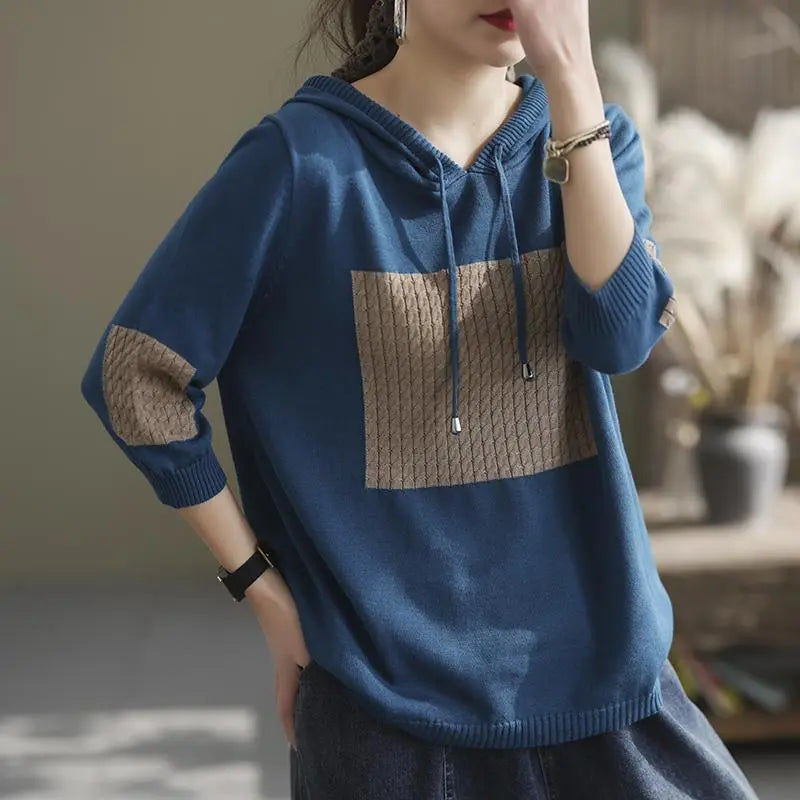Introducing the Thin Worsted Causal Hoodies Patchwork Leisure Loose Pullover Hooded Women's Comfortable Clothing, a unique and stylish addition to your wardrobe.