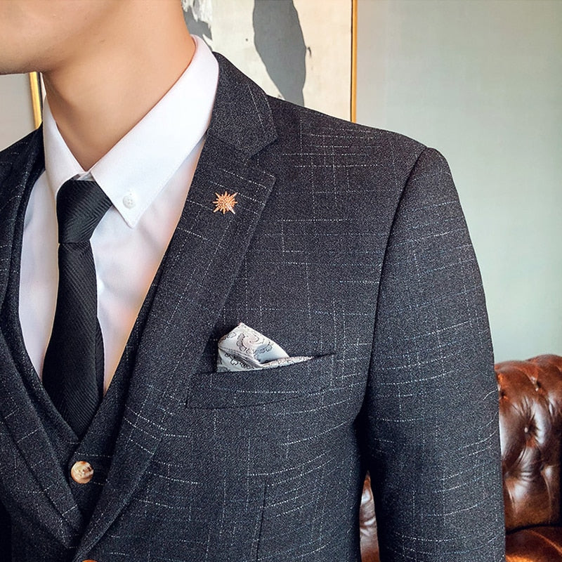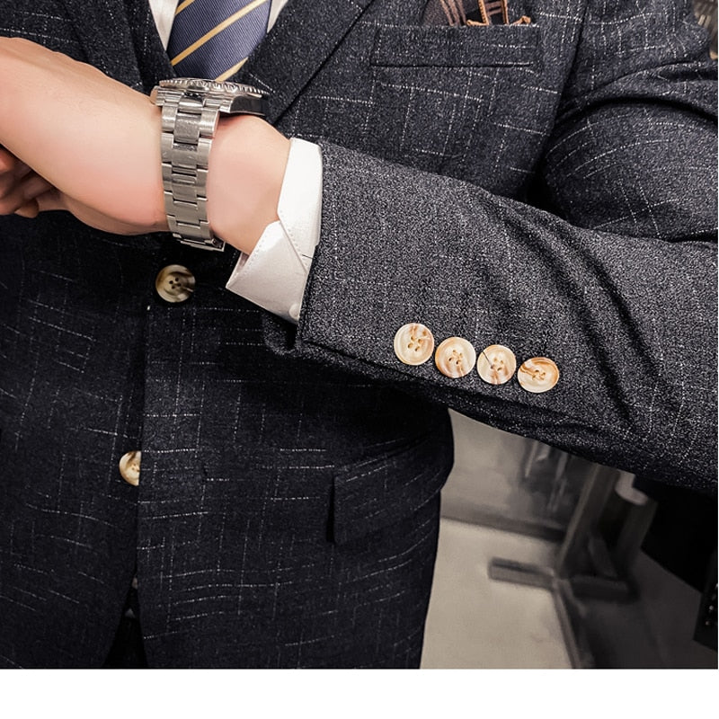Three pieces set ( Blazer + Vest + Pants ) Elegant Suit Dark Plaid Classic Retro Men's Formal Business Wedding Dress
