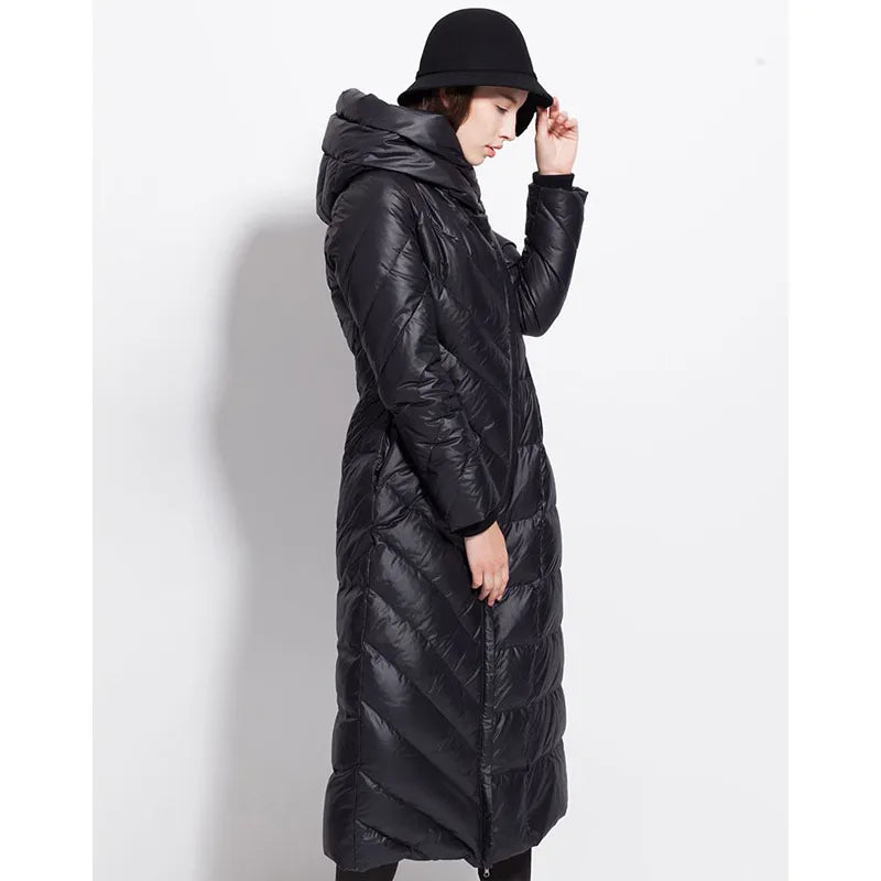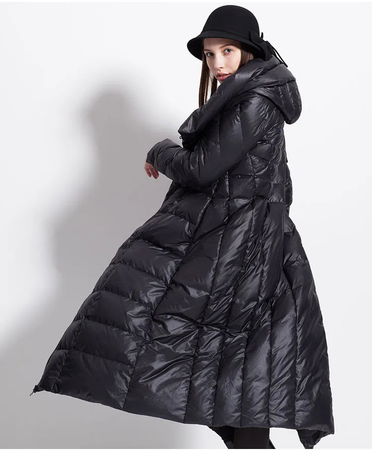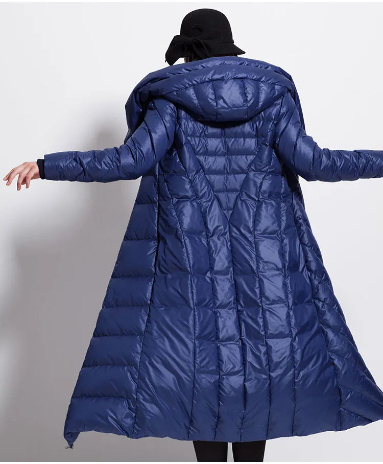 - This unique coat is designed to keep you warm and stylish, with its X-long length and thick filling of white duck down.