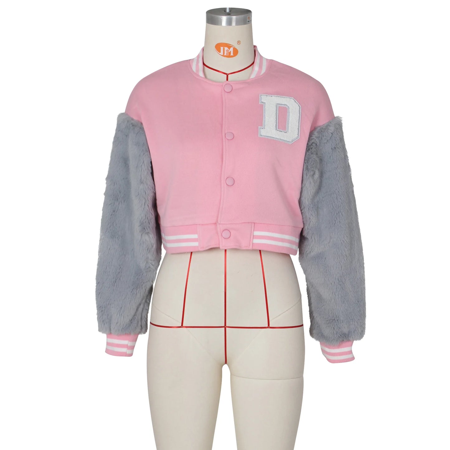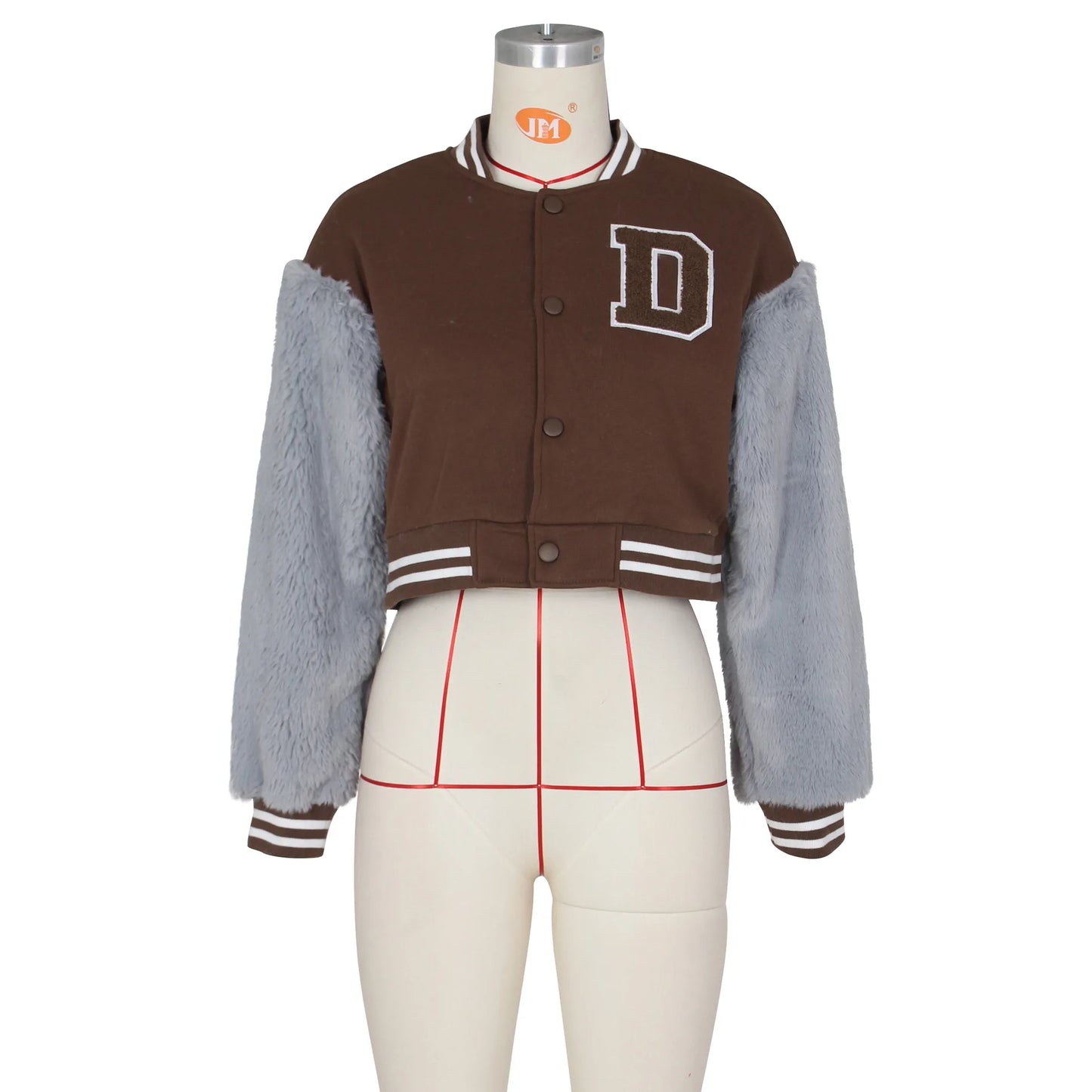 Winter Trending Faux Fur Sleeve Coat Varsity Jacket for Women