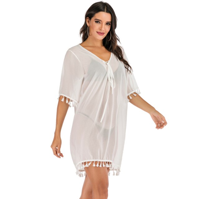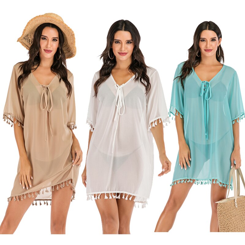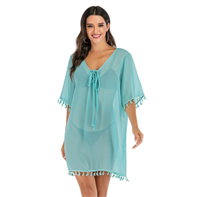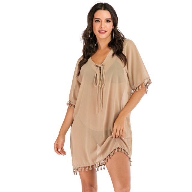 Women Beach Dress Tassel Bikini Cover Up Pareo Chiffon Plus Size Loose Beachwear