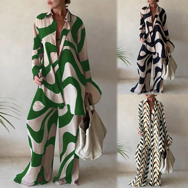 Women Loose Long Shirt + Long Pants 2 piece Set Printed V-neck Lapel Collar Tops Casual Suits