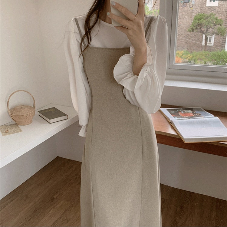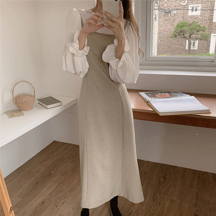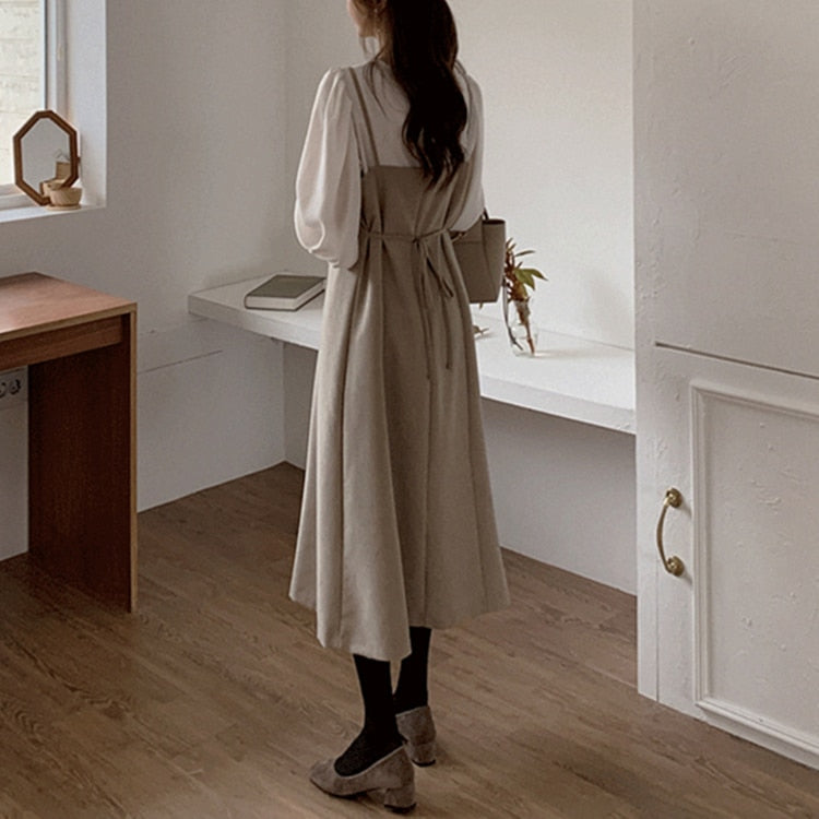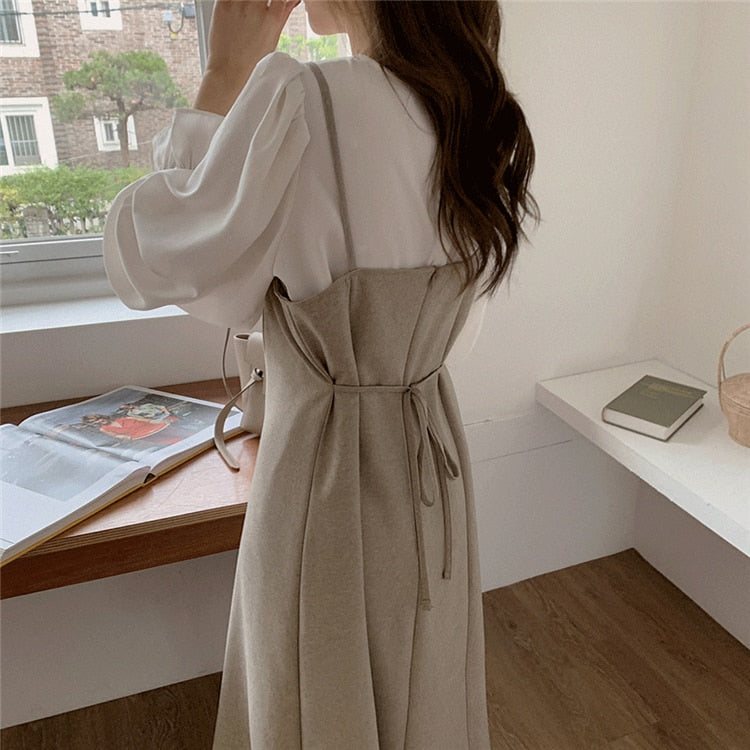 Women's 2 Pieces Blouses Sleeveless Dresses Fashionable Elegant Vintage Lace Up Long Suits