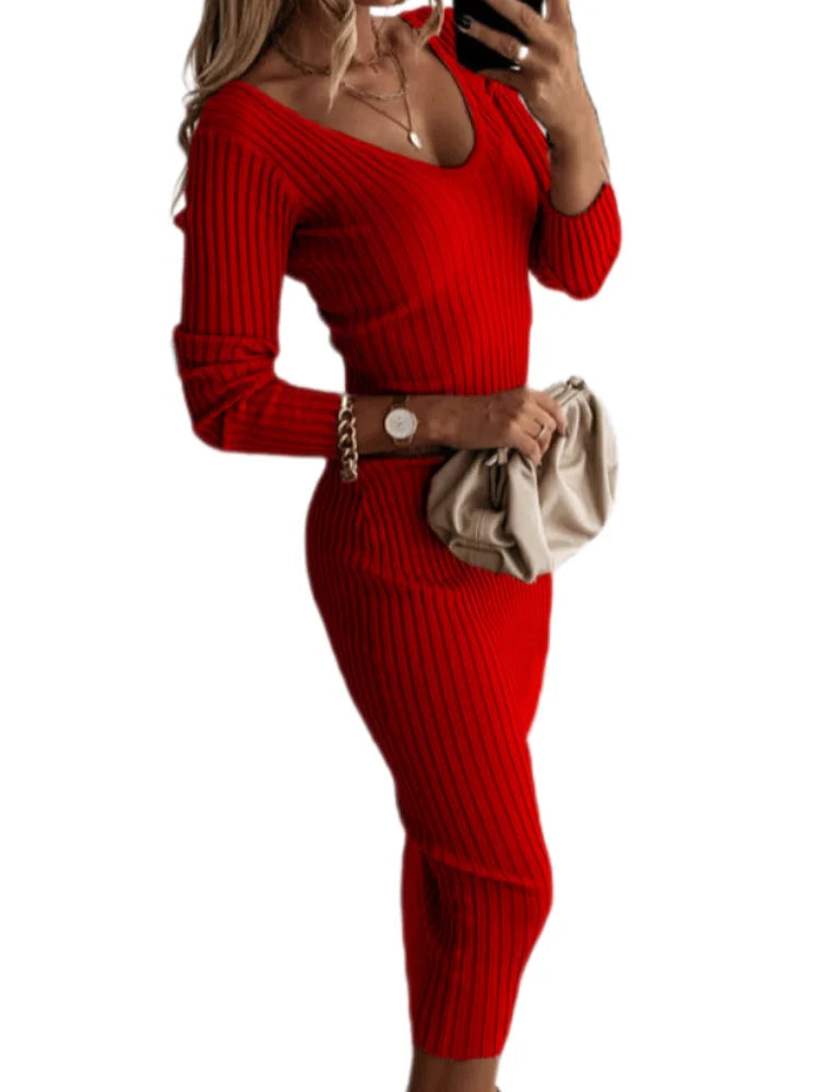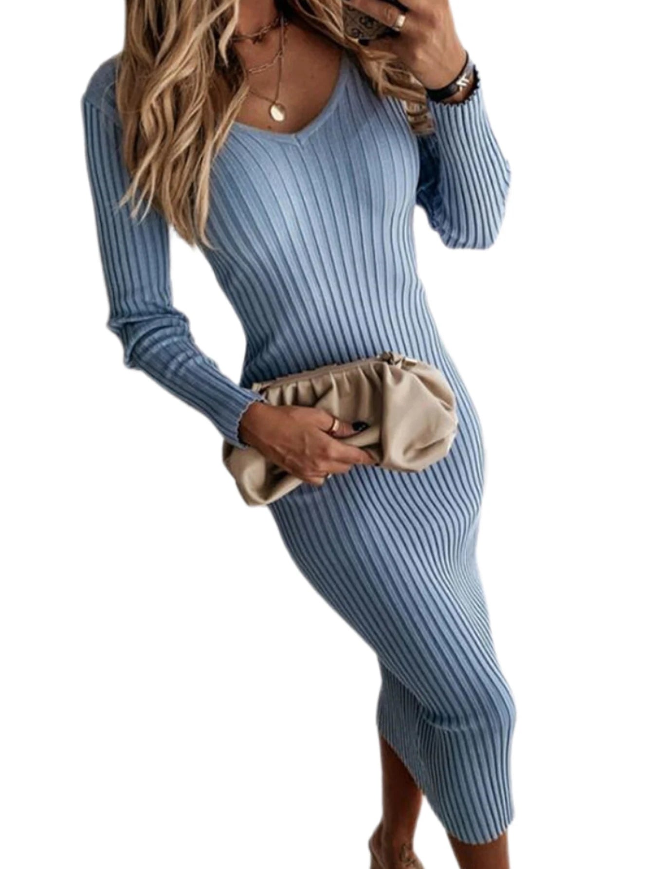 Women's Elastic Bodycon Sweater Long Sleeve Knitted Solid V- Neck Midi Casual Pencil Dress