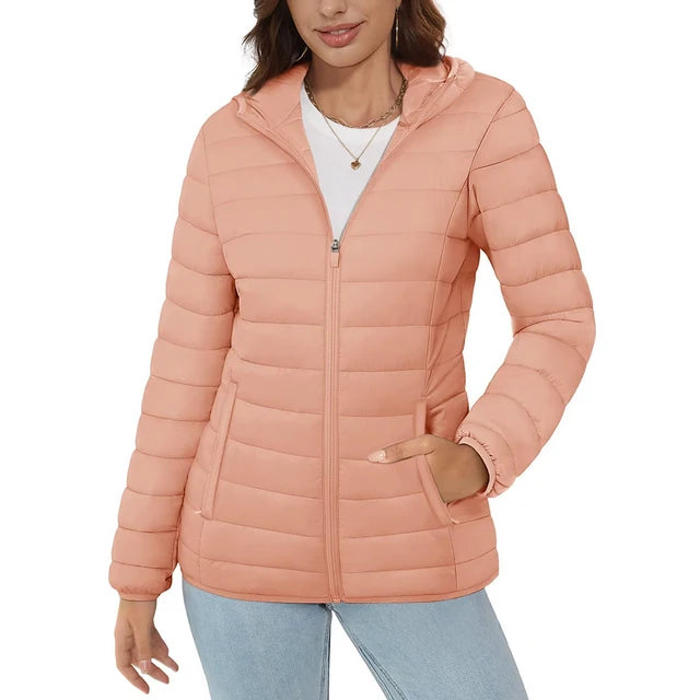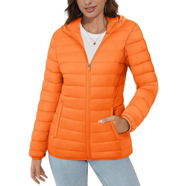 Women's Hooded Puffer Jacket Lightweight Quilted Padded 3 Pockets Zip-up Winter Warm Outerwear