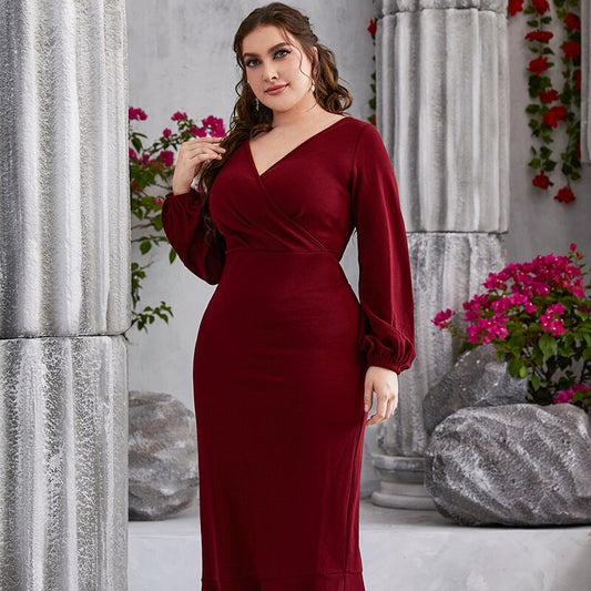 Elegant Plus Size Pencil Bodycon V-Neck High Waist Long Lantern Sleeve dress for women