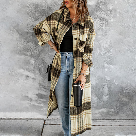 New Fashion Winter Women's Clothing Pocketed Grid Pattern Overcoat Knit Cardigan Long Trench Coat